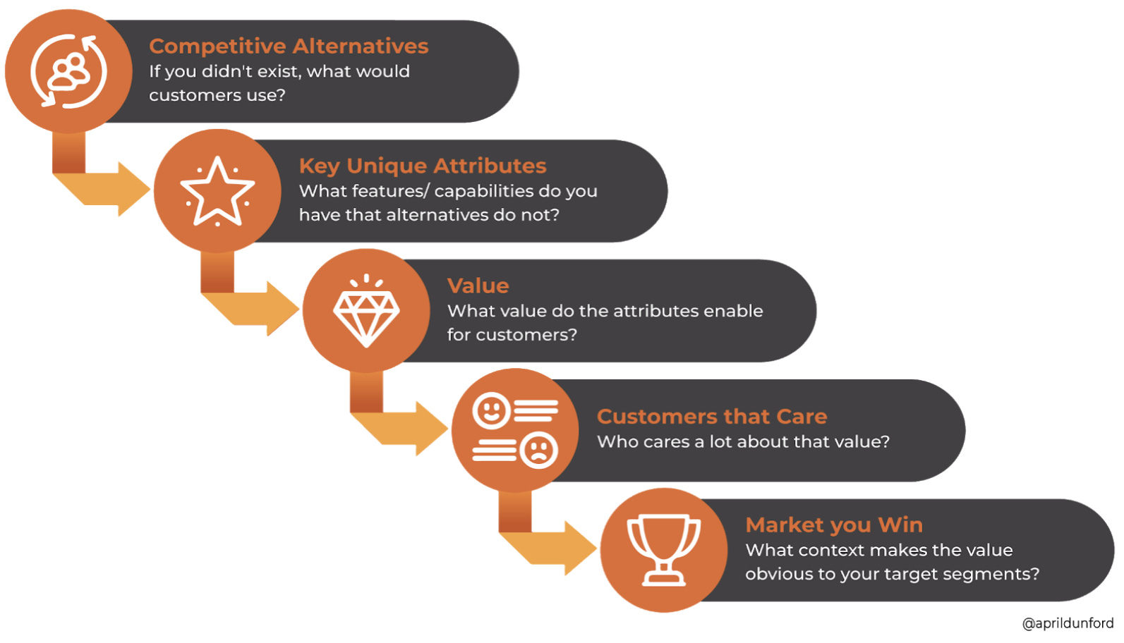 April’s recommendation is to actually start by thinking about “How do I have to position myself against “ and find the “competitive alternatives”- not to get confused with only the direct competition. They include the following: